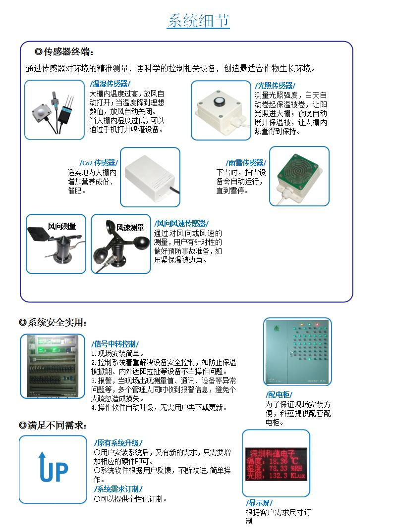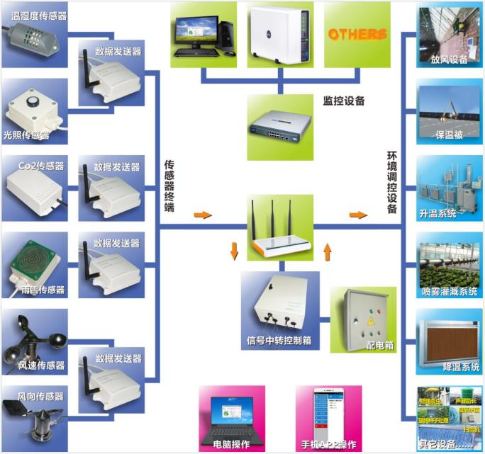 傳感器終端如溫度濕度傳感器、光照傳感器、土壤溫濕度、CO2傳感器、雨雪傳感器、風(fēng)速傳感器、風(fēng)向傳感器等,將信息采集發(fā)送到信號采集系統(tǒng),信號采集系統(tǒng)再通過云發(fā)送信息到電腦、手機端,通過電腦、手機端就可以直接對各環(huán)境調(diào)控設(shè)備如通風(fēng)系統(tǒng)、遮陽保暖系統(tǒng)、升溫系統(tǒng)、降溫系統(tǒng)、噴霧灌溉系統(tǒng)、降濕系統(tǒng)或其它設(shè)備等進行調(diào)控。