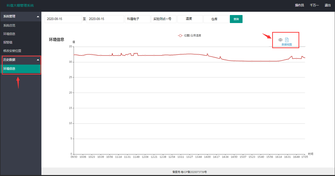 點(diǎn)擊“歷史數(shù)據(jù)”選擇下拉選項(xiàng)的“環(huán)境信息”,根據(jù)您要查詢(xún)的參數(shù)查詢(xún)會(huì)顯示如下曲線圖,若您需下載數(shù)據(jù),請(qǐng)點(diǎn)擊右側(cè)紅框所示中的眼睛圖案;若想要數(shù)據(jù)查看,請(qǐng)點(diǎn)擊旁邊的文件圖案(鼠標(biāo)移至?xí)刑崾荆?nbsp;